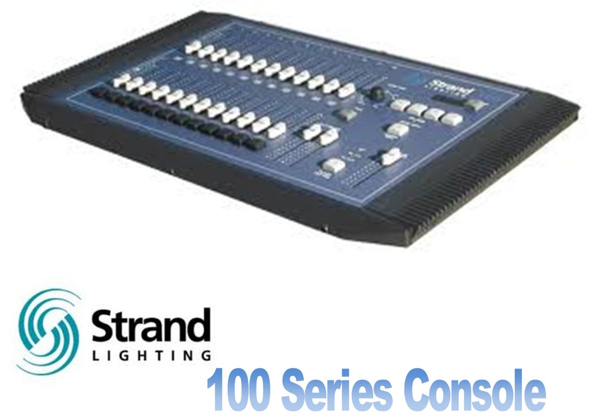 The Strand 100 series console is a small, simple to use, preset lighting desk. It can either control 24 channels in 1 scene or 12 channels in 2 scenes with the ability to expand scenes with the Hold feature. The console also has the ability to run a single effect. It is also possible to program a single theatrical cue stack of 99 memories and play these back. This console can be rack mounted.